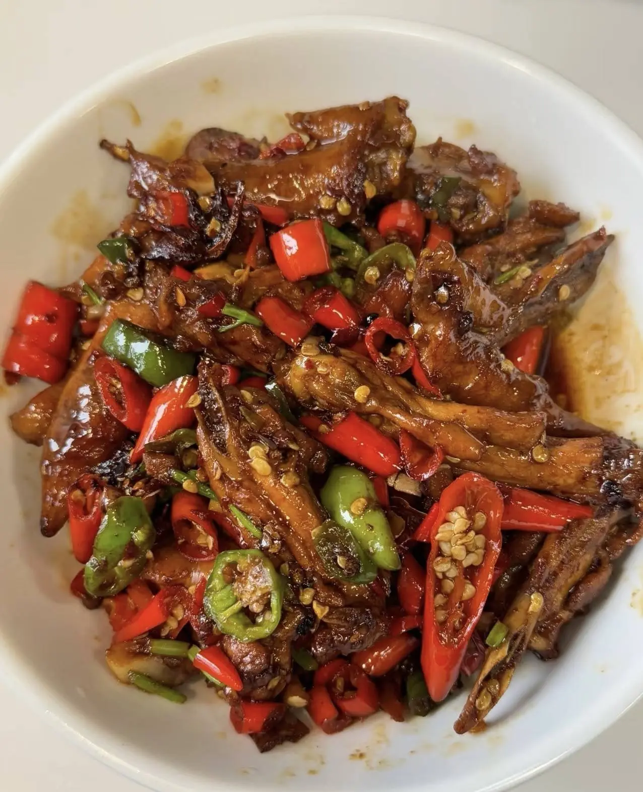 五、装盘与调味将炸好的爆辣香辣鸡翅摆放在盘中,撒上熟白芝麻和葱花作为点缀。如果喜欢更辣的口感,可以在装盘前再撒上一层辣椒粉。这样,一道色香味俱佳的爆辣香辣鸡翅就完成了。六、美食品鉴爆辣香辣鸡翅以其独特的辣味和香脆的口感征服了无数食客的味蕾。当你咬下第一口时,首先感受到的是酥脆的外皮和鲜嫩的肉质;紧接着,辣味开始在舌尖上蔓延开来,刺激着你的味蕾;最后,当你细细品味时,还能感受到鸡翅中蕴含的丰富层次感。这道美食不仅适合作为下酒菜,也是家庭聚会、朋友聚餐时的绝佳选择。